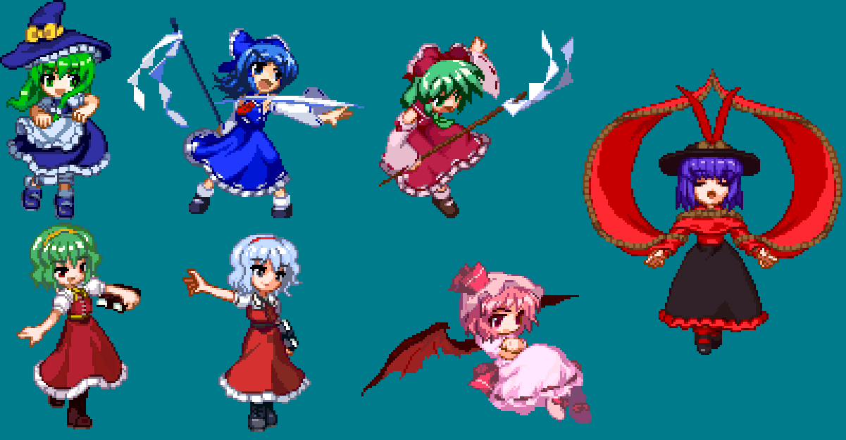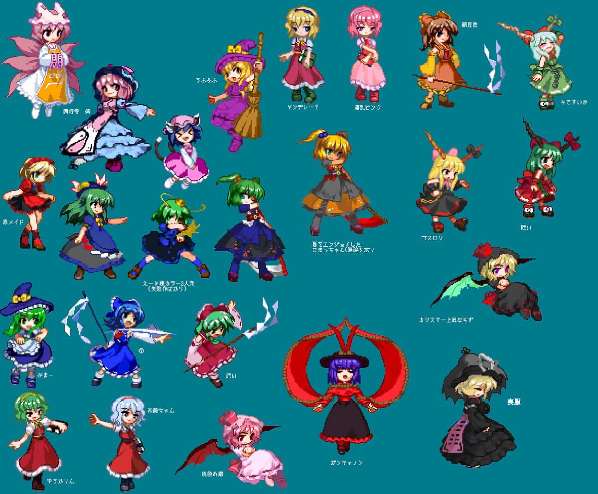 プレイ以外でも色々やってたり。 たまにはカラーでも弄ってみようかとぽちってます。 どれもこれも二番煎じな気もしますが… 二種類ほどリクエストがあって作ったものです。 魔理沙:魅魔さまカラー エプロンと袖がパレット共通なのでバランスに悩みました。 霊夢:⑨カラー あたいったら最強ね! リボンの兼ね合いで霊夢で作成。 転びモーションが⑨っぽくて自分的に満足 雛カラー 厄いカラー。 服など細かいところも弄ってますが、並べないとわからないかも…。 胸のリボン?は雛の結んだ髪をイメージに。 アリス:ゆうかりんカラー 一番最初に作ったもの。 アリスの髪を緑にしたらゆうかりんに似てるんじゃね!? と思い勢いで作成。案外良い出来。 神綺さまカラー アリスのママンカラー。 現在のマイカラーだったり。 レミリア:魔法少女ベホイミカラー 「ぱにぽに」からのスピンオフ作品よりベホイミカラー。 これも人からのリクエスト。むずい! 淡いピンク色がすごい難しかったのですよ。 羽ははためくマフラーのイメージで赤ベースに。 衣玖:ガンキャノンカラー ガンキャノンこと八坂神奈子さま色。…絶対誰もが思いつく。 衣を注連縄に見立てて…緊縛プレイじゃないよ! 目に痛いです。 >ハティさん 機会があったらまた対戦でもー。 数ヶ月戦ってない気がするので成長度合いが気になるのよ。 フルレイプにならない事を祈っておきましょう。