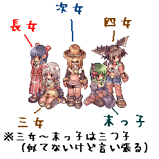 知ったことか!! なんかその弊害?というか自業自得でしょうけど 垢ハック被害が出てきてるみたいですね。 廃人乙、っと。 んー…何を書くべきか…。 すっごい今更ながら自キャラ紹介でもしておきますか。 長女:月奈(つくな)Agi殴り支援廃プリ 現在86/53…まだまだ上がると思うんだけど… 一応自Gのギルマス業務。ツンデレ(らしい 次女:罠兎(みんと)弓鷹微妙ハム 91/50。A>D>L>Iという微妙ステの為ソロがががが。 劇団の団長を務めてます。カリスマが欲しい。 三女~末っ子は全員ベース71(5/1現在)という…頑張ろうよ自分。 三女:椛(もみじ)A>S>Dスイッチ騎士 名前は某弾幕ゲーから頂きました。わんこ可愛いよわんこ。 色々まっしぐら! 四女:来華(らいか)S>A戦闘BS これも名前は某漫画から。思いつかなかったんだよ。 基本清算用、多分自キャラ内だと一番真面目な子。 末っ子:歌留多(かるた)I>D=V支援(予定 純支援なるべく只今修行中。組める臨が無くて切ない感じ。 嫌味にならない程度に甘える方法教えて下さい。 コメお返事 >ORANさん 怪我の方は快方に向かってるので大丈夫ですよー! でもこれ以上続いたらお払いしようかな…。
